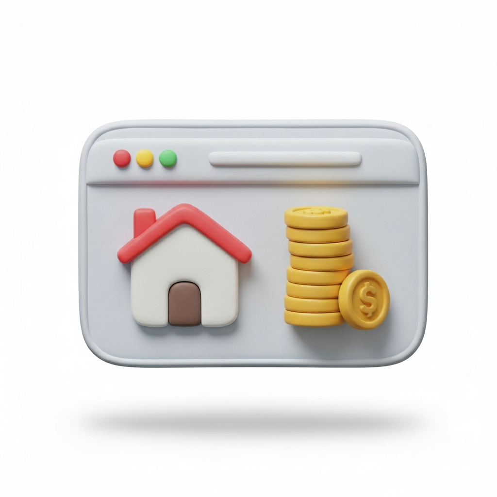 A 3d icon of a stylized web browser window. Inside the window, there is a simple house icon next to a stack of golden coins, representing housing finance content on a webpage. The icon is rendered in a soft claymation style with a clean design, isolated on a plain white background. + remove fingerprints