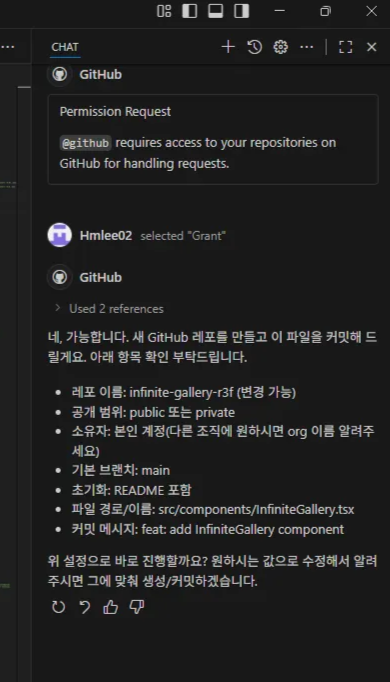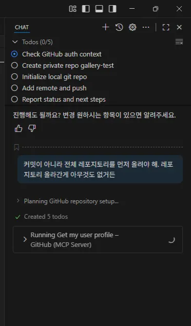 @github로 mcp를 호출하고 내 깃허브 계정에 커밋할 수 있도록 세팅해달라고 요청했다. 왼쪽 이미지는 요청사항대로 커밋할 수 있도록 레포지토리 정보를 설정해준 이미지이고, 오른쪽 이미지는 정보 설정 완료 후 레포지토리를 생성해 커밋하는 To-do 리스트를 만들어 진행하는 장면이다. 에이전트 실행은 모두 자동으로 진행됐다.