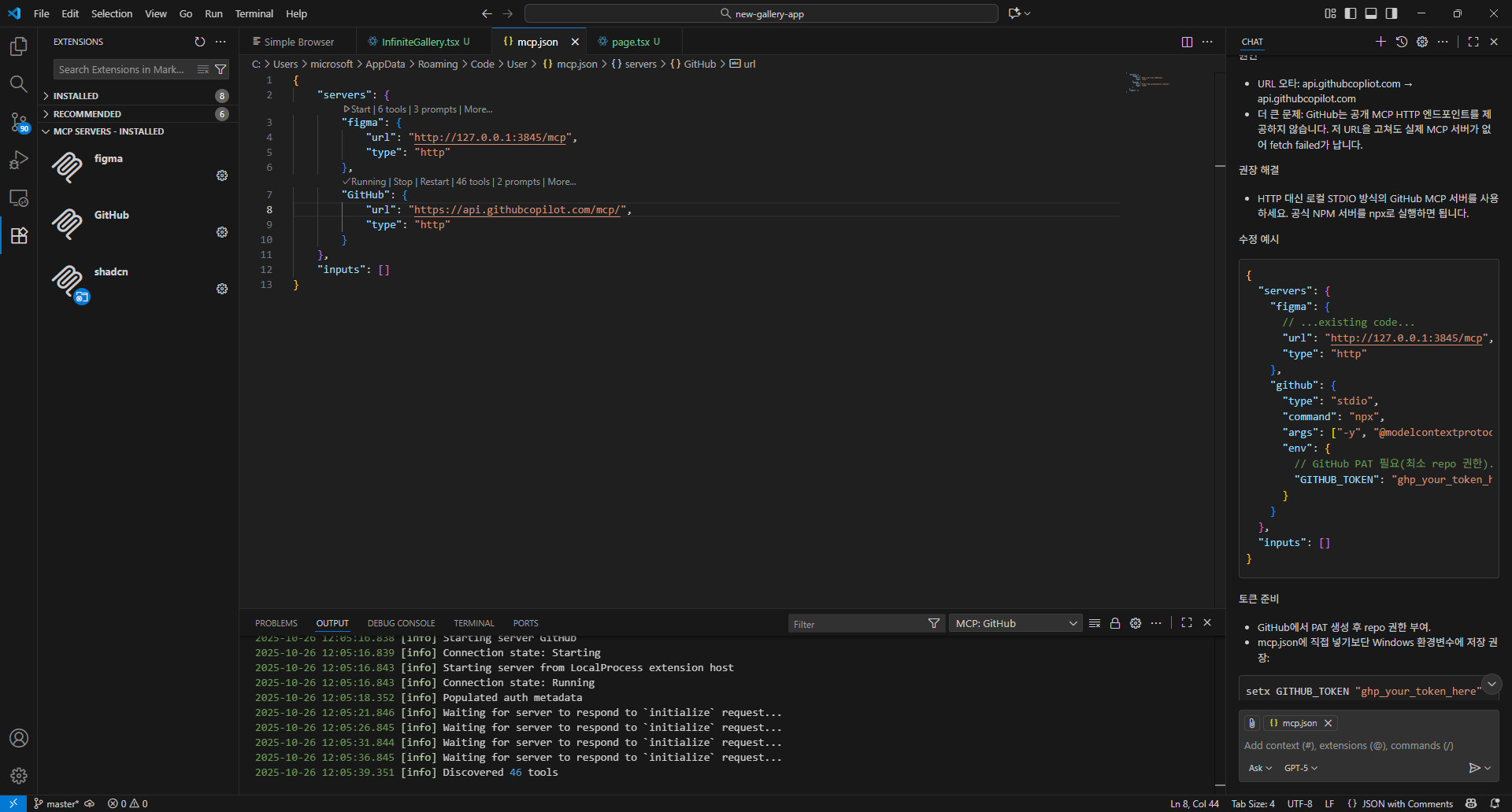 vscode 내부 settings.json에 깃허브에서 제공하는 url을 이용해 mcp 서버 설치를 진행했다.