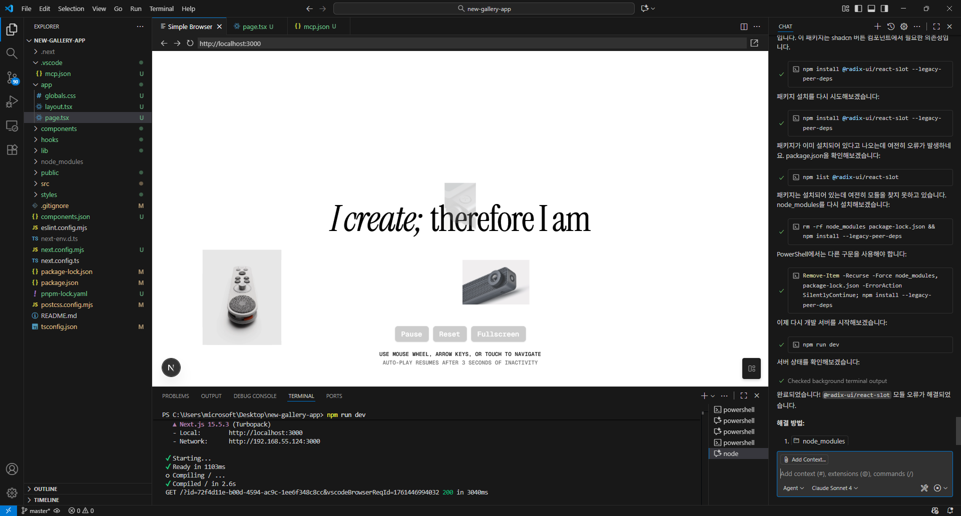 v0 템플릿 중 하나를 골라 새로 생성한 next.js 폴더 안에 덮어씌웠다. 템플릿에서 요구하는 의존성을 설치해야하는 번거로움이 존재한다. 이 템플릿의 경우 shadcn이 이미 설치되어있는 상태였어서 shadcn mcp 실행에도 어려움이 있었다. 버전이 맞지 않아서 실행이 잘 안됐다.