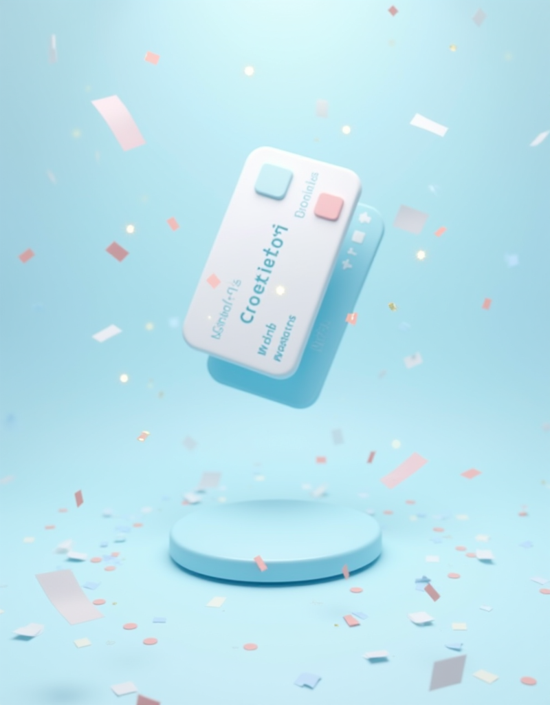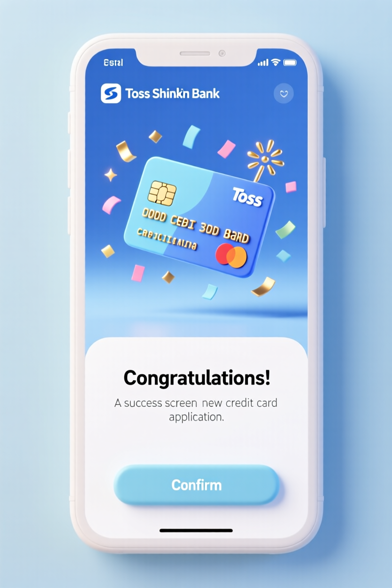 (masterpiece, best quality, ultra-detailed), a complete mobile app screen UI layout, user interface design. A success screen celebrating a new credit card application. In the upper-middle of the screen, a beautiful 3d clay credit card floats with cute confetti and sparkles. Below the central image, there is a dedicated clean space for a headline text "Congratulations!" and a short body text. At the very bottom of the screen, there is a prominent and clear 'Confirm' button, designed in a matching soft 3D clay style. Minimalist and clean design inspired by Toss and Shinhan Bank apps, dominant colors are pastel blue and white with a hint of celebratory gold, soft and cheerful lighting, octane render, perfectly balanced composition, clear visual hierarchy, trending on Dribbble.