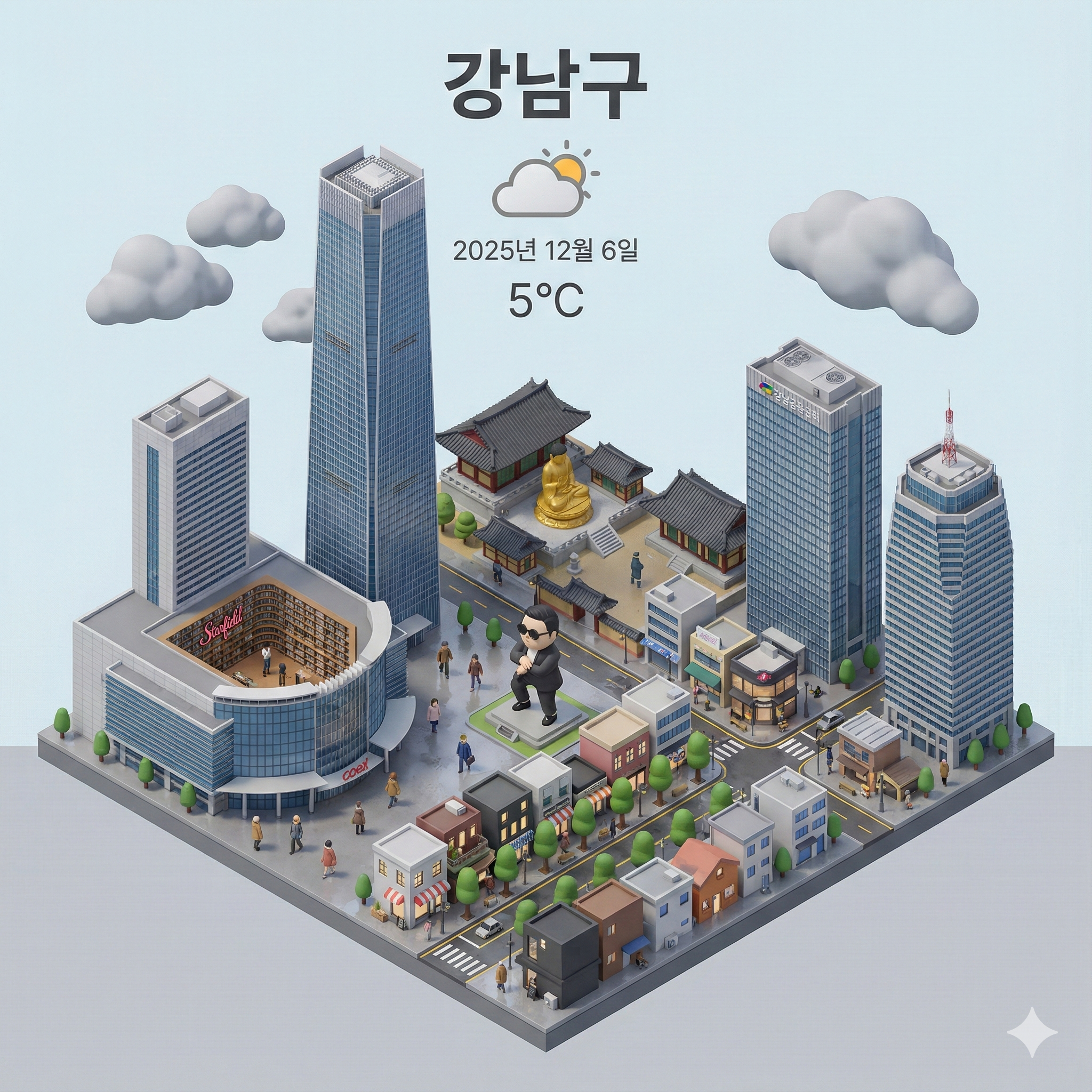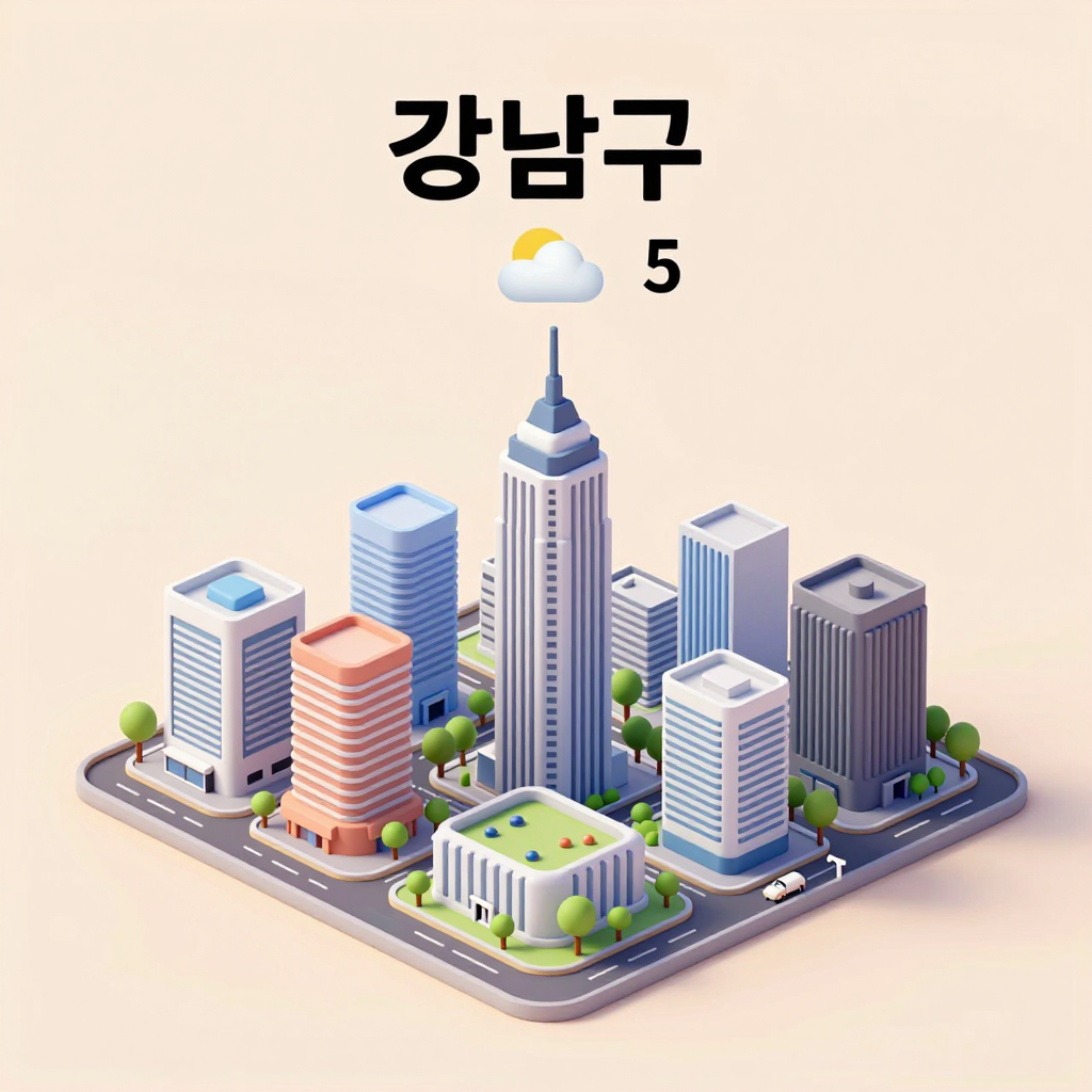 프롬프트 : Present a clear, 45° top-down isometric miniature 3D cartoon scene of 강남구, featuring its most iconic landmarks and architectural elements. Use soft, refined textures with realistic PBR materials and gentle, lifelike lighting and shadows. Integrate the current weather conditions directly into the city environment to create an immersive atmospheric mood.