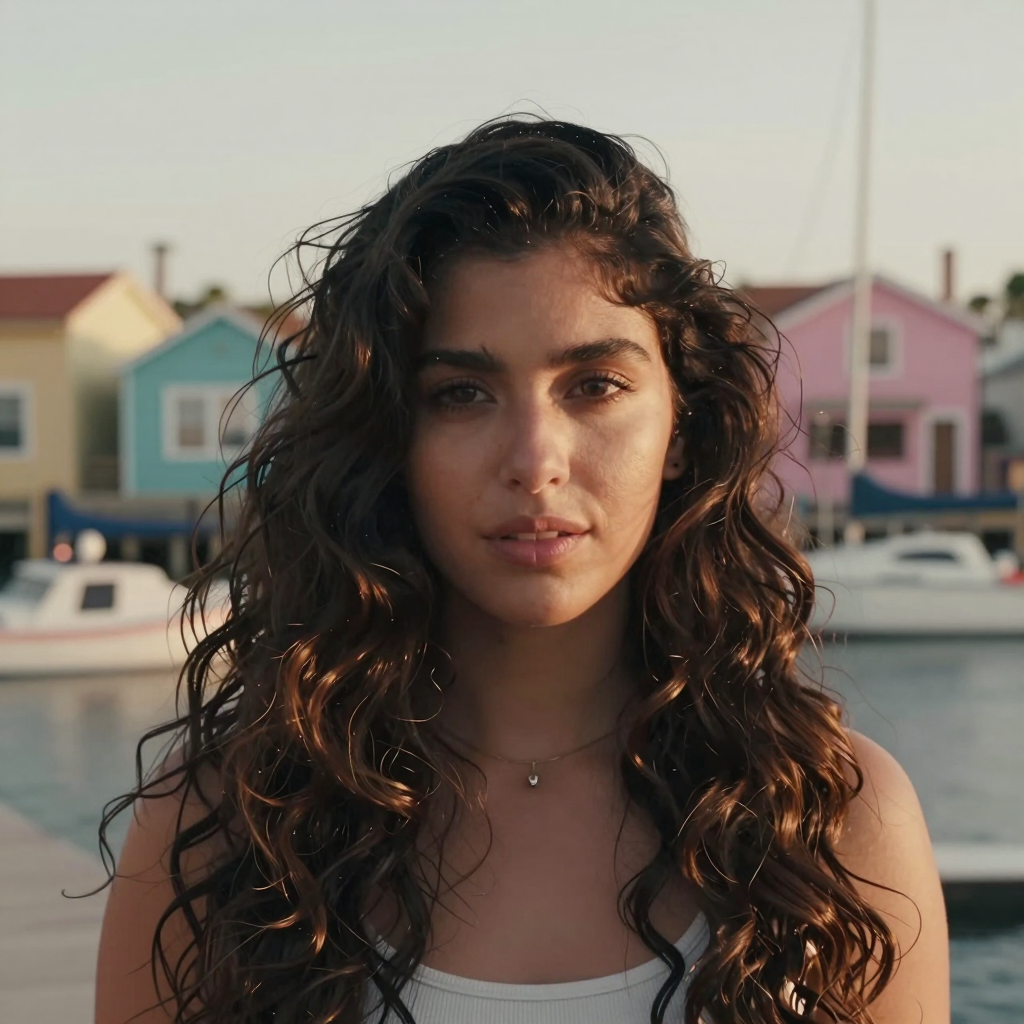 프롬프트 : Latina female with thick wavy hair, harbor boats and pastel houses behind. Breezy seaside light, warm tones, cinematic close-up.