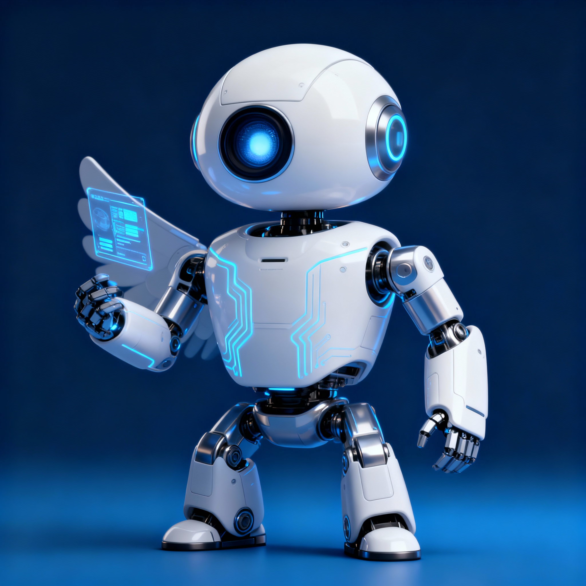 Action: (standing in a confident, helpful pose), Details: (subtle glowing blue circuit patterns on its body:1.2), (sleek metallic and white plastic textures), (one eye is a soft glowing camera lens:1.1), (a small holographic data screen floating near its wing),