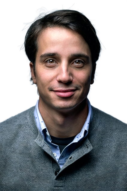 정면을 응시하며 미소 짓고 있는 남성의 모습입니다. 짙은 갈색 머리, 갈색 눈, 그리고 회색 니트 스웨터와 그 안에 받쳐 입은 파란색 셔츠의 질감까지 세밀하게 표현됩니다. 인물의 윤곽선을 따라 배경과 분리된 상태입니다.