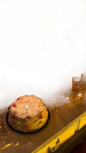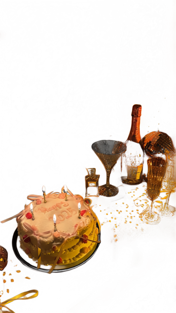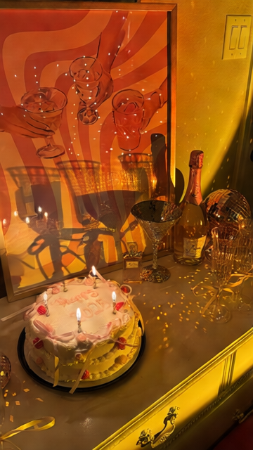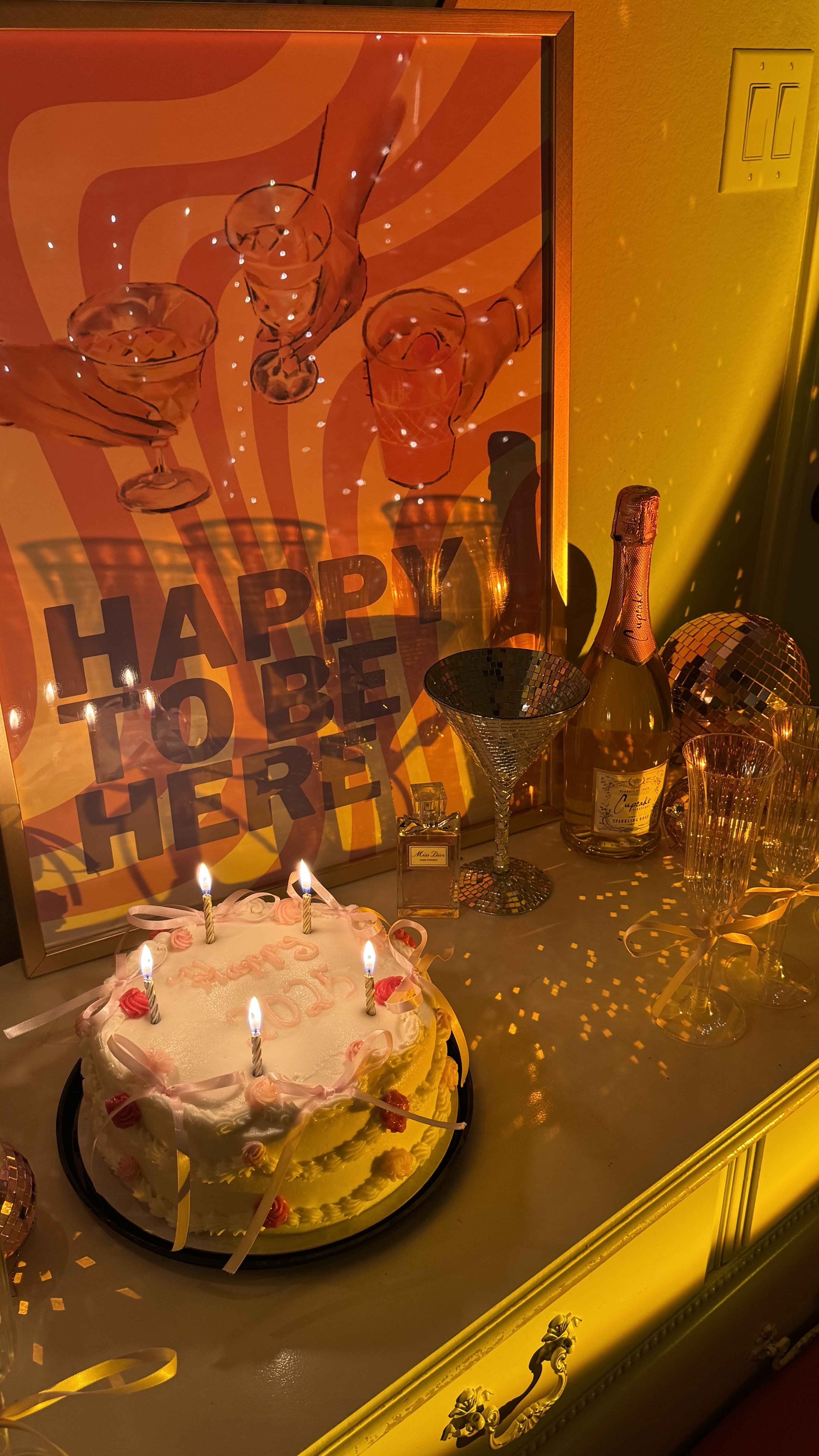 The collection of items arranged on the right side of the dresser surface. This includes the bottle of pink sparkling rosé, the faceted disco-ball style martini glass, two tall champagne flutes tied with gold ribbons, the small square perfume bottle, and the mirrored disco ball ornament tucked behind them. - Layer 4: Birthday Cake