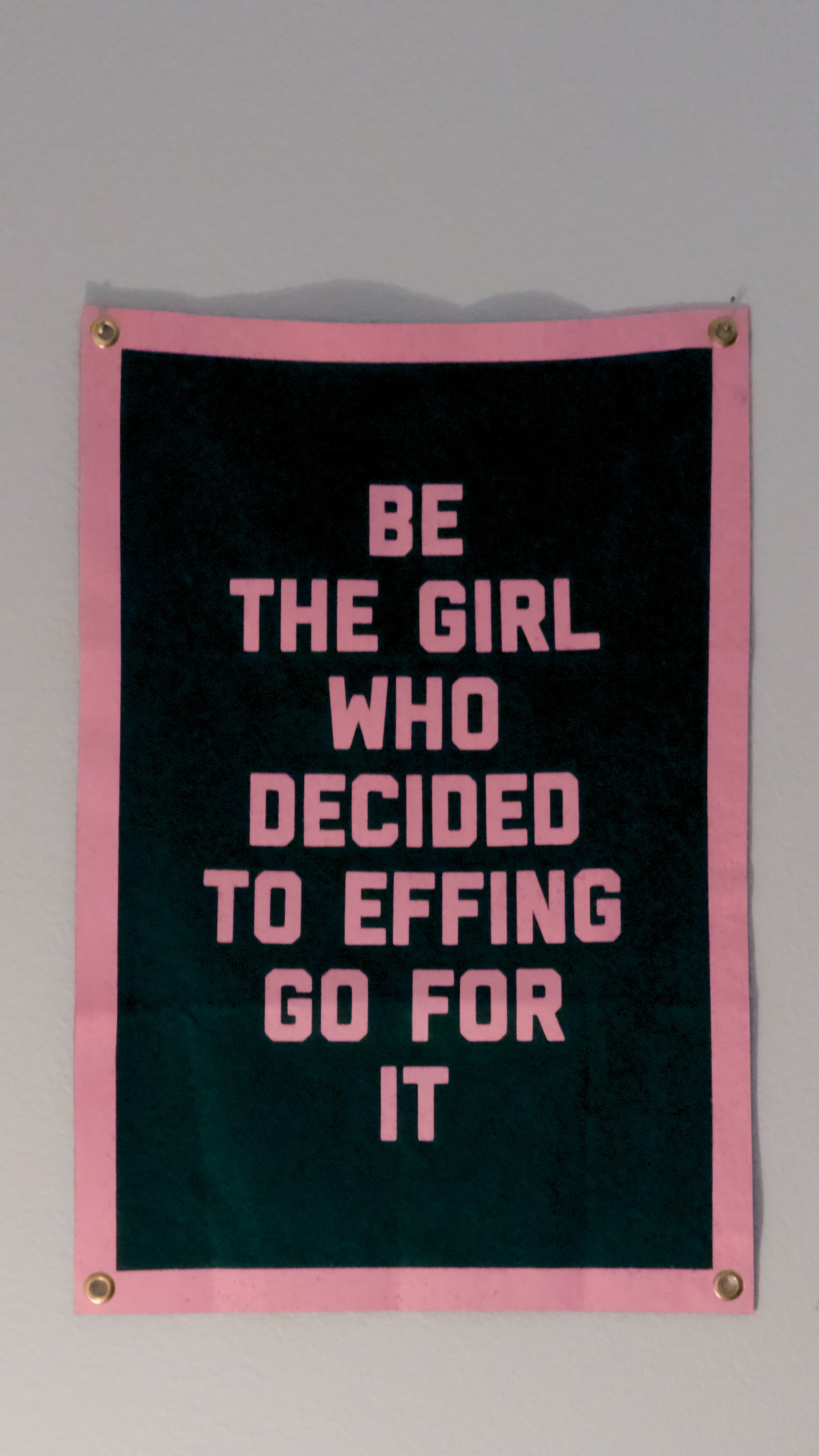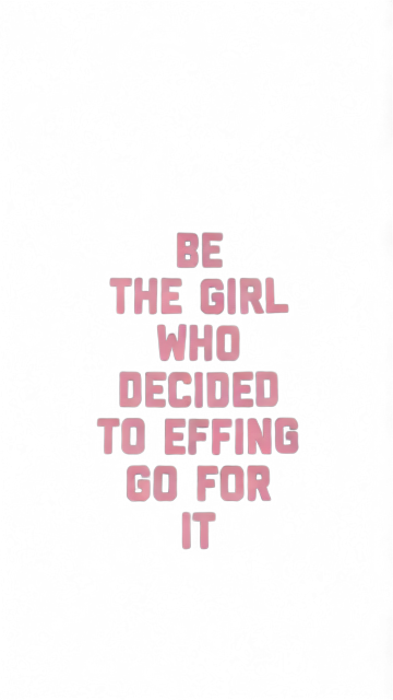 포스터 중앙에 위치한 분홍색 글자들입니다. 'BE THE GIRL WHO DECIDED TO EFFING GO FOR IT'이라는 문구가 대문자 블록체로 여러 줄에 걸쳐 배열되어 있습니다. 펠트 질감 위에 인쇄된 듯한 분홍색의 질감과 색감을 정확히 표현합니다. 배경이나 다른 요소 없이 오직 글자들만 존재합니다.