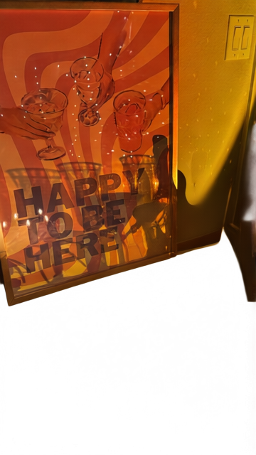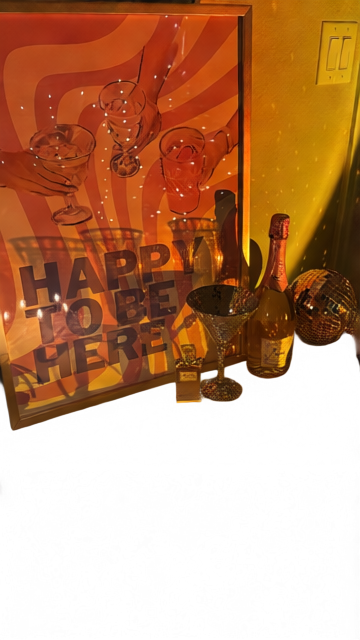 The large, framed art print leaning against the wall. It features a retro design with warm orange and red wavy swirls, illustrations of three hands raising cocktail glasses, and large, bold, dark text overlaying the graphic that reads "HAPPY TO BE HERE". - Layer 3: Bottles, Glasses, and Accessories