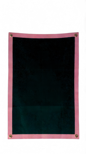 텍스트를 제외한 포스터의 전체적인 배경 부분입니다. 짙은 검은색 펠트 또는 천 질감의 직사각형 영역과, 그 가장자리를 둘러싼 분홍색 테두리를 포함합니다. 네 모서리에는 압정이 박혔던 작은 구멍 자국이 남아 있습니다. 분홍색 글자들은 모두 제거된 상태입니다. - 레이어 3: 텍스트 (Text)