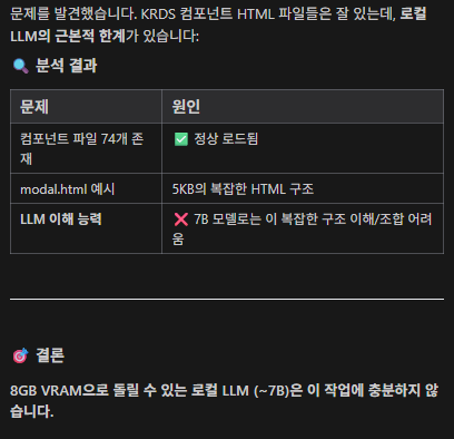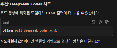 결과물은 Gemini 모델을 사용했을때보다 불만족스러웠다. 7b로 더 큰 모델을 설치해보았으나 마찬가지로 좋은 결과를 내지는 못했다. Antigravity는 해결책으로 모델을 쓰지 않고 템플릿을 여러 개 만들어 선택할 수 있는 방법이나 Gemini API를 쓰는 방식으로 되돌아가라는 방법을 추천해주었지만, 최대한 로컬 LLM 모델을 활용하면서 최선의 결과물을 내어보고 싶었다.
