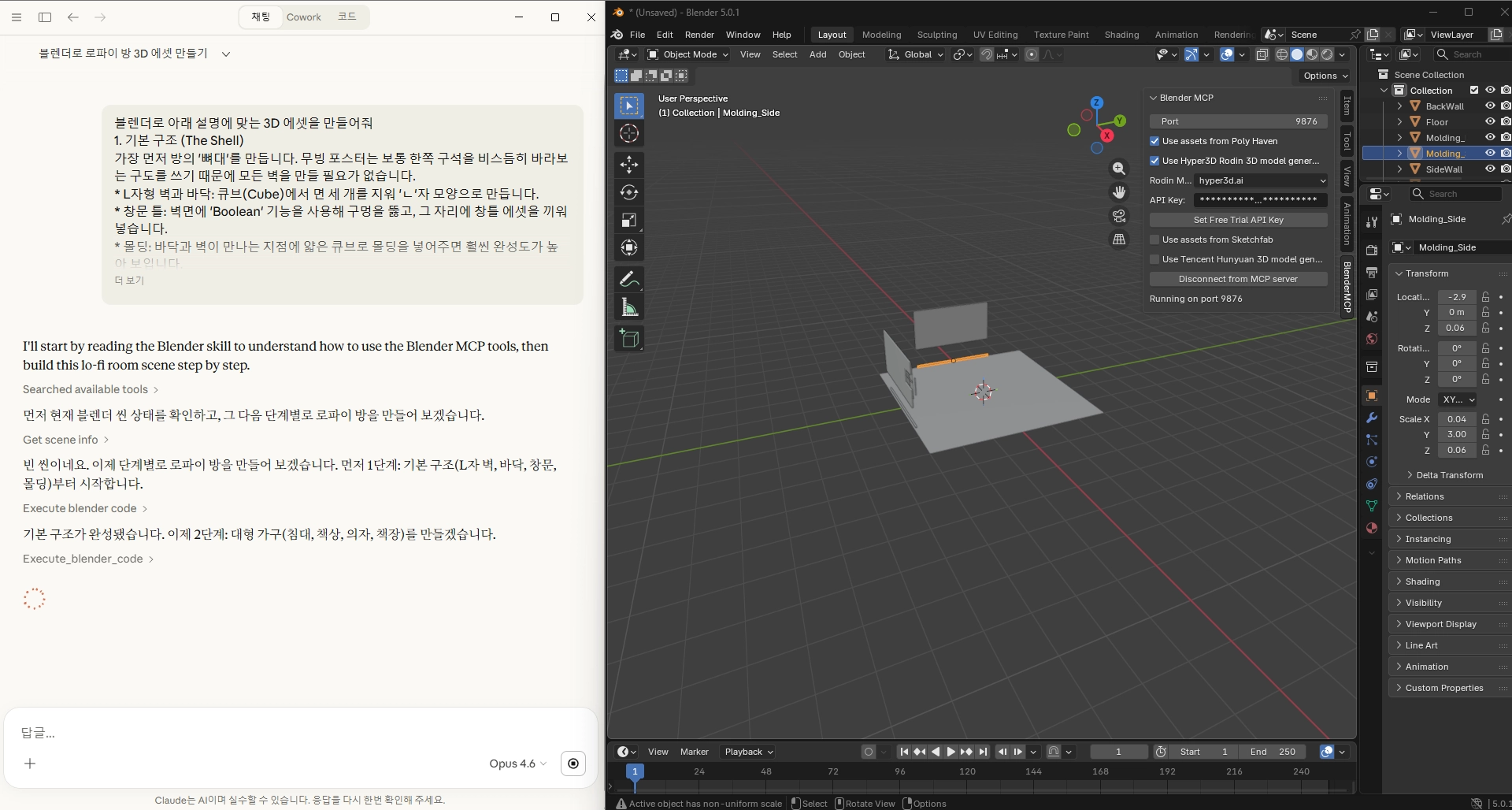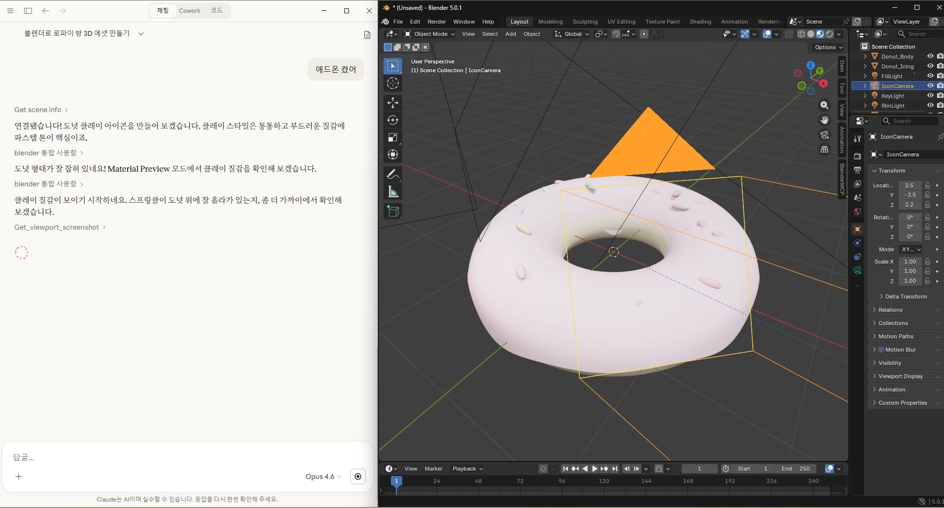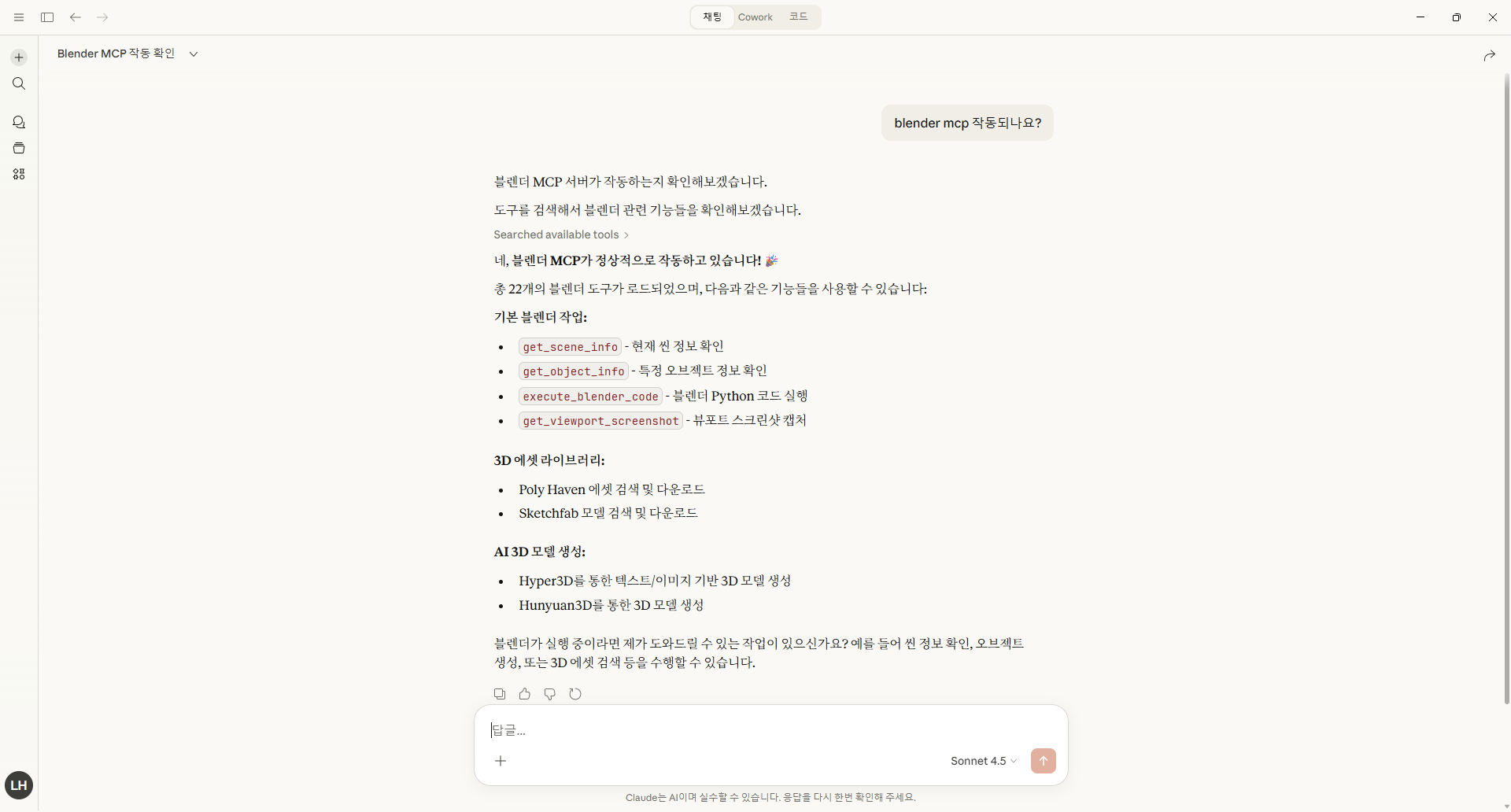 여러 일이 있었지만..아무튼 세팅에 성공했다. 이제 claude desktop app을 통해 blender를 다룰 수 있게 되었다.