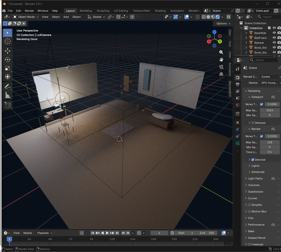 로파이 방을 만들어달라고 했는데…방은 방인데 로파이 느낌까지는 잘 모르겠다. 렌더링 미리보기 설정까지 하니 제법 그럴싸한 느낌은 난다.