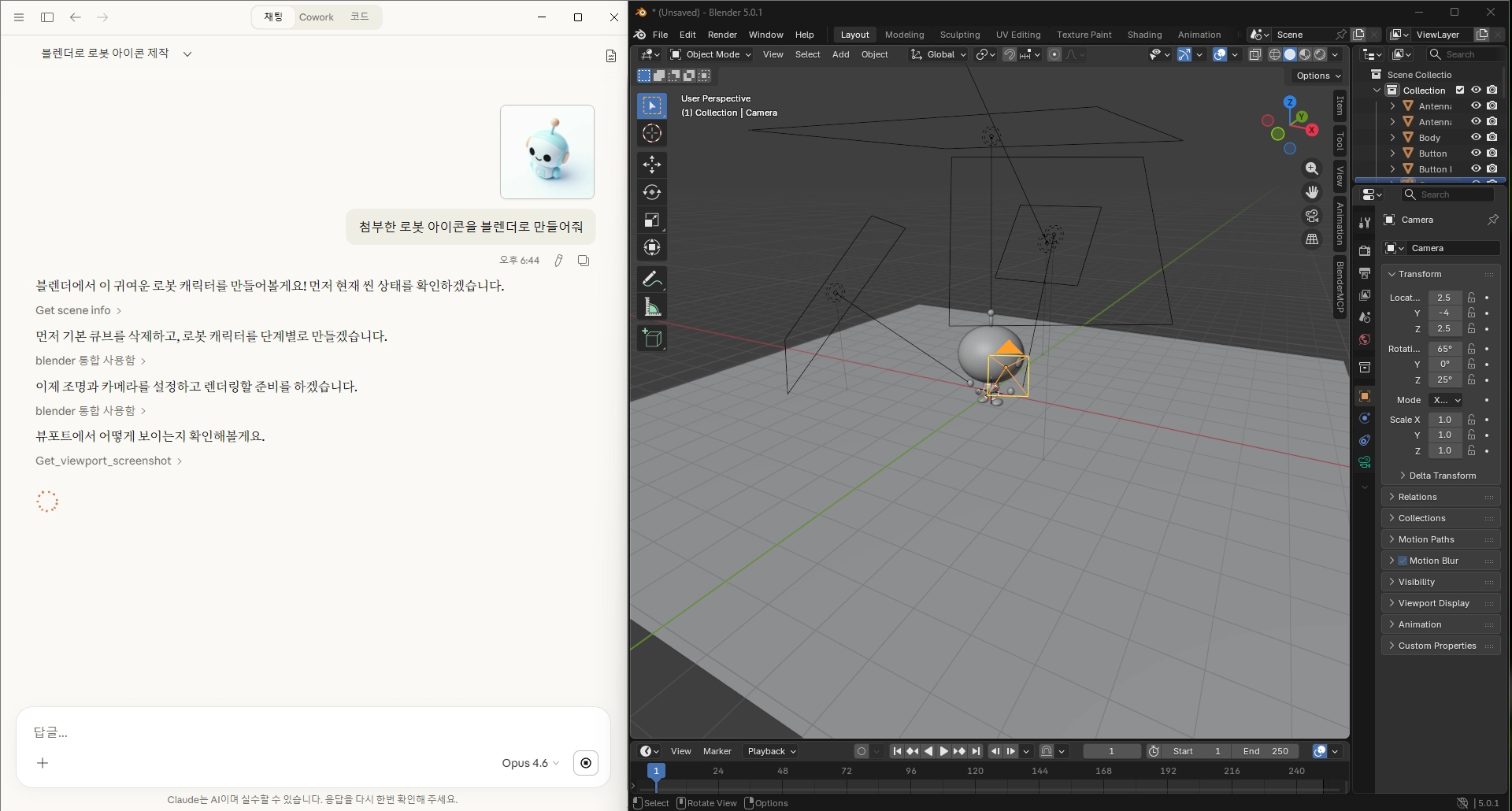 추가로 이미지를 3D 파일로 변환시키는 작업도 진행해보았다. comfyUI로 만들었던 로봇 아이콘 이미지를 던지고 블렌더로 만들어달라고 요청하니, 이미지를 읽고 작업하는 모습을 확인할 수 있었다.