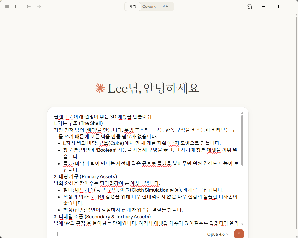 초기 세팅은 토큰 걱정 때문에 Sonnet 모델로 진행했는데, 3D 작업은 Opus 4.6 모델로 진행했다.