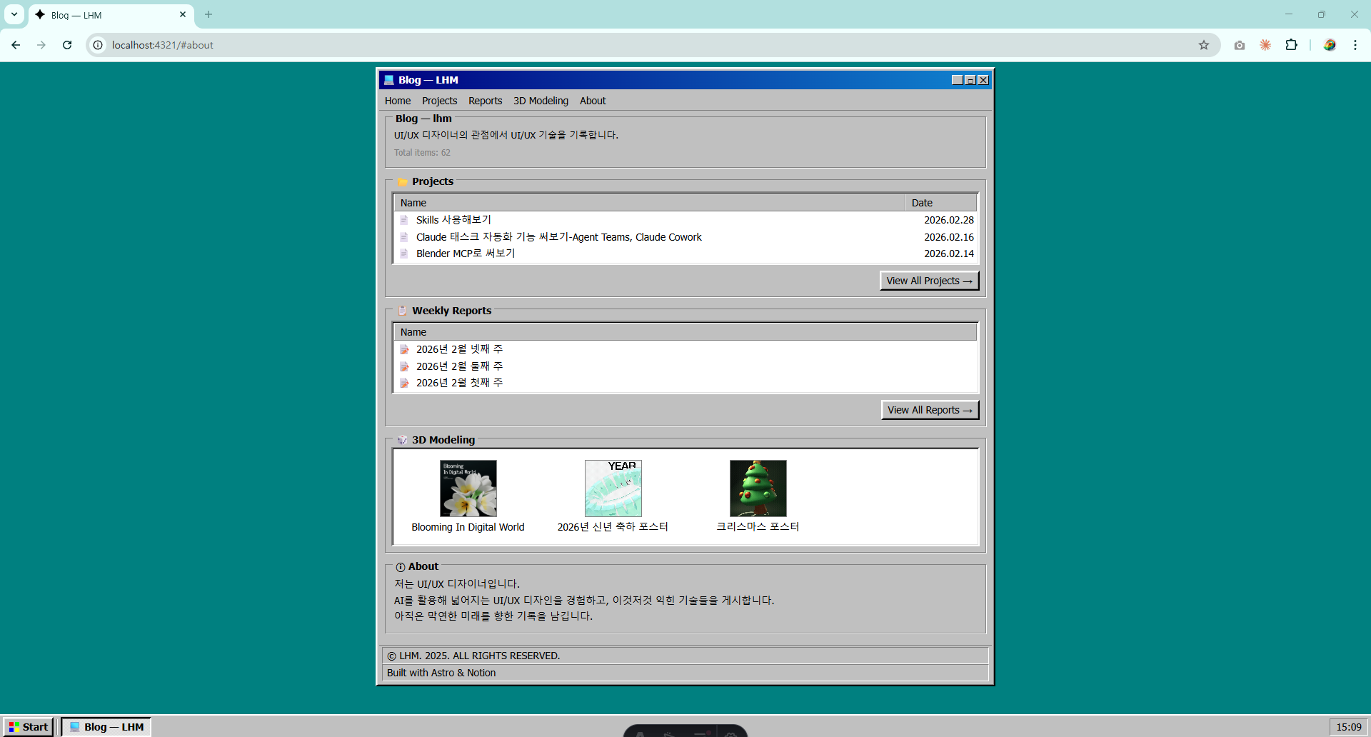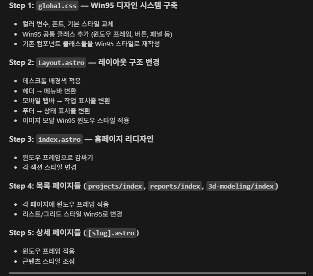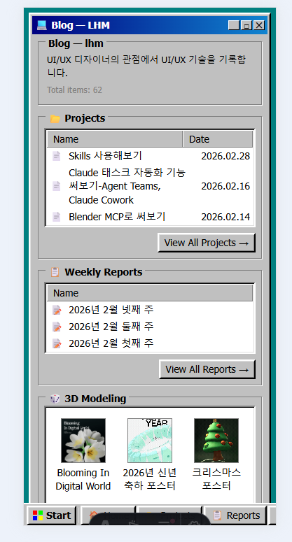 작업이 완료된 화면이다. 생각보다 윈도우95 스타일을 너무 충실하게 가져와서 놀랐다. 반응형 처리도 잘 되어있어서 모바일 화면에서도 문제없이 블로그를 볼 수 있게 되었다.