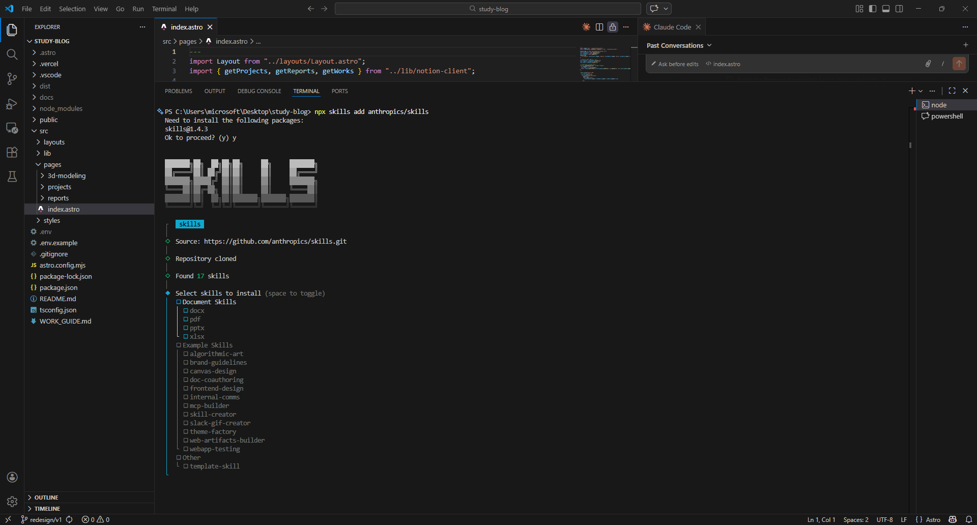 skills 폴더를 다운받아 직접 폴더에 넣을 수도 있지만, 터미널 npx 명령을 통해서도 다운받을 수 있다. skills를 기술 블로그 작업 폴더 안에 포함시켰다.