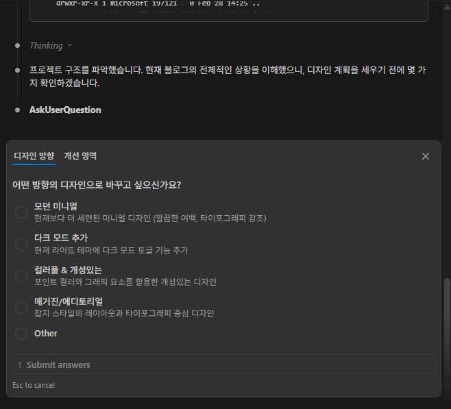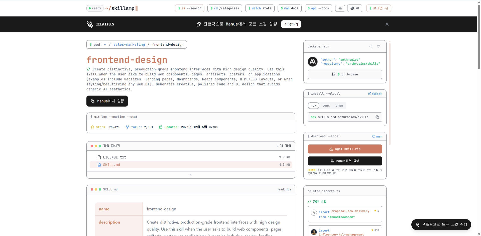 위 URL은 다양한 스킬을 한번에 모아보고 마음에 드는 걸 골라볼 수 있는 마켓플레이스로, 여기에 UIUX 디자인과 프론트엔드 관련 스킬이 있길래 한번 가져다가 사용해보기로 했다. 쓰는 김에 좀 재미있는 걸 해보고 싶어 이 기술 블로그 디자인을 갈아엎어보기로 했다.