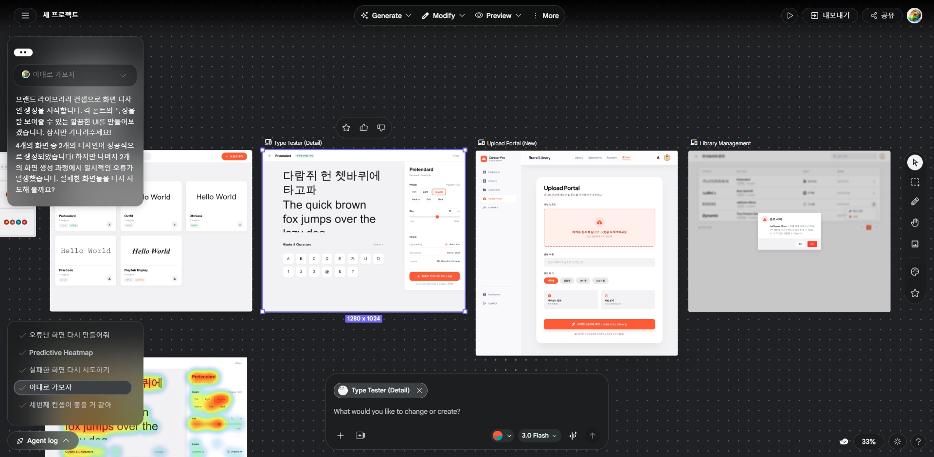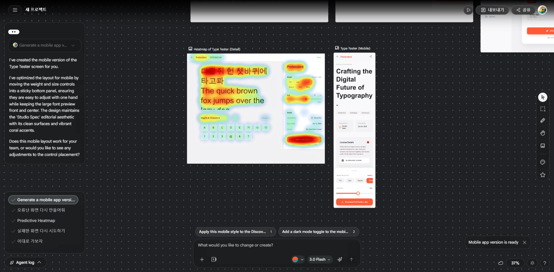 과거 Stitch에서 지원해주지 않거나, 구현되지 않았던 두 기능이었기 때문에 더 인상적이었던 듯 싶다. 앱 아니면 웹 둘 중 하나만 구현이 가능했었는데 이제는 반응형 생성을 지원하고, 예측 히트맵을 생성해주어 디자인 뿐 아니라 앞단인 화면 기획까지 커버할 수 있는 점을 확인했다.
