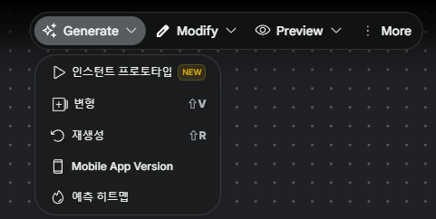 작업된 화면은 프롬프트를 입력해 추가 수정을 해도 되고, 특정 화면을 선택해 상단 메뉴를 통해 수정해도 된다. 주요 수정 작업은 ‘Generate’에서 확인할 수 있는데, 앱 화면으로 변경시켜주는 Mobile App Version과 히트맵을 제작해주는 예측 히트맵 메뉴가 인상적이었다.