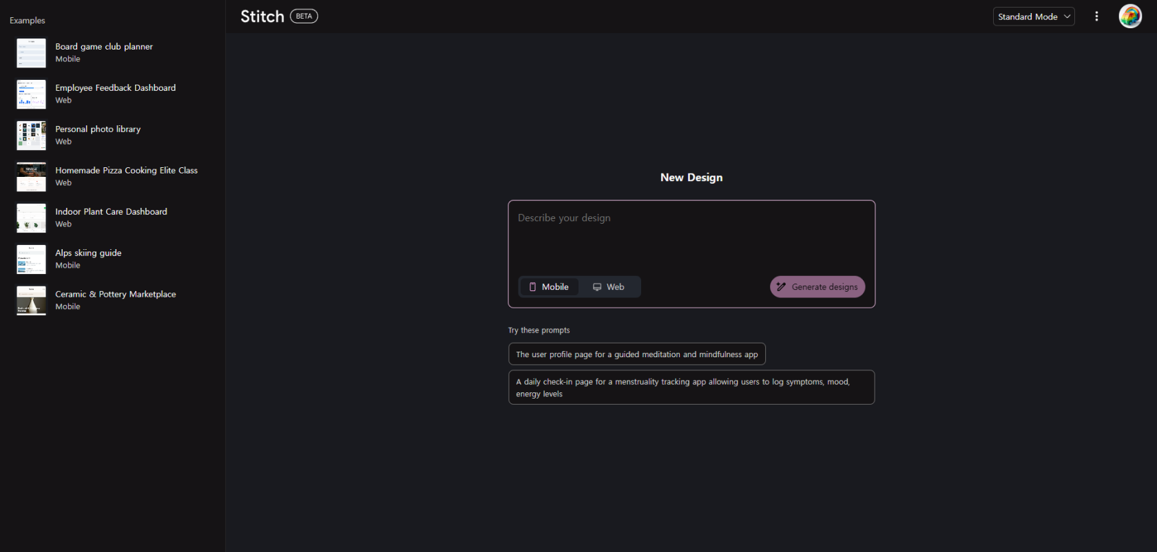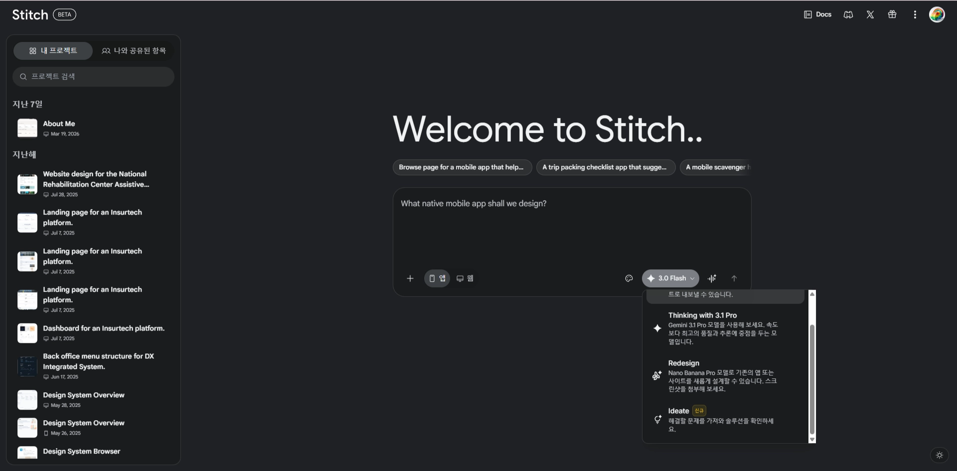 과거에는 Standard Mode와 Experience Mode로 나뉘고(우측 상단에서 선택), 프롬프트 입력창에는 웹 아니면 앱 둘 중 하나의 사이즈를 선택한 후 프롬프트를 입력하게 구성했는데, 이제는 모드 대신 모델을 선택하고(Standard Mode가 Gemini 3를, Experience Mode가 Gemini 3.1을 쓰게끔 선택지가 바뀐 듯 하다) Redesign과 Ideate라는 새로운 선택지가 추가로 생겨났다.