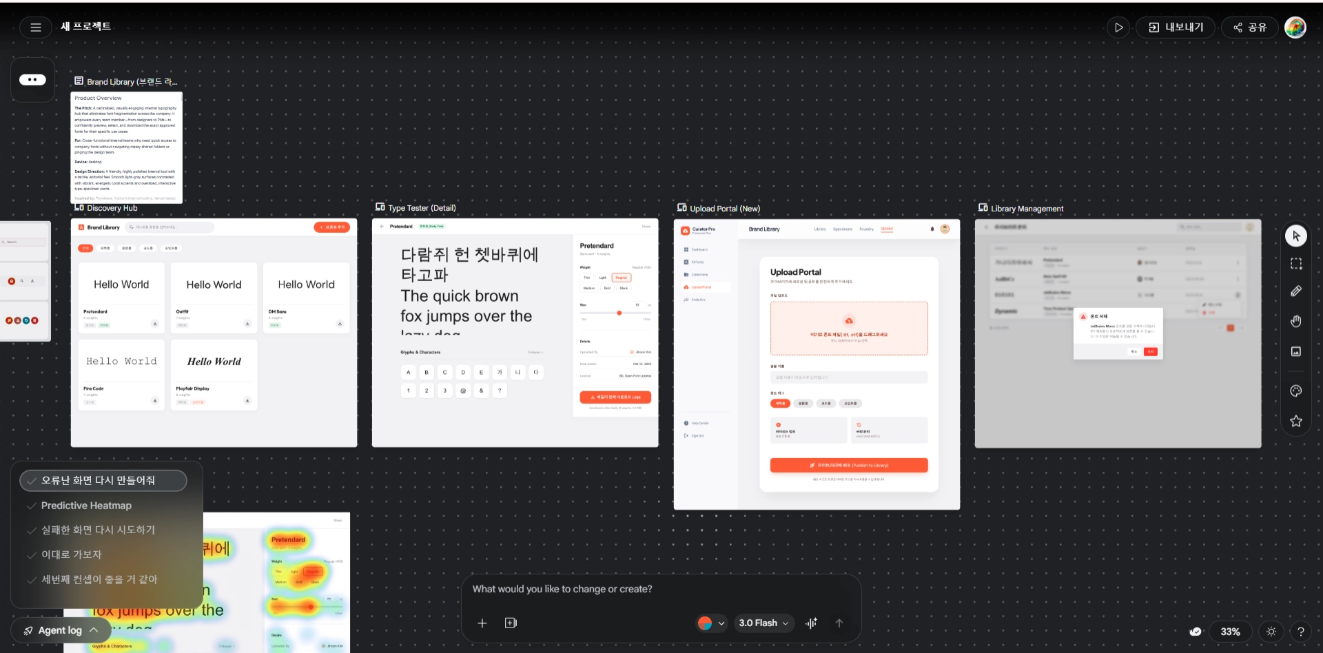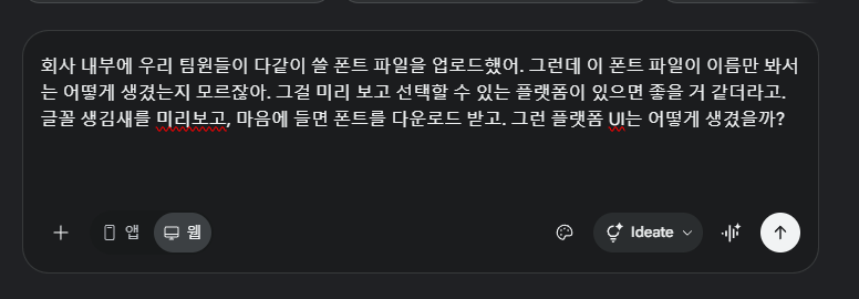 제일 궁금한 Ideate 기능을 한번 써보기로 했다. 마침 지난주 떠오른 아이디어 중에 ‘1본부 폰트 미리보기 플랫폼’이 있었는데, Claude Code로 처음부터 작업할 계획을 틀어 Stitch에서 먼저 화면 디자인을 들어가보기로 했다.