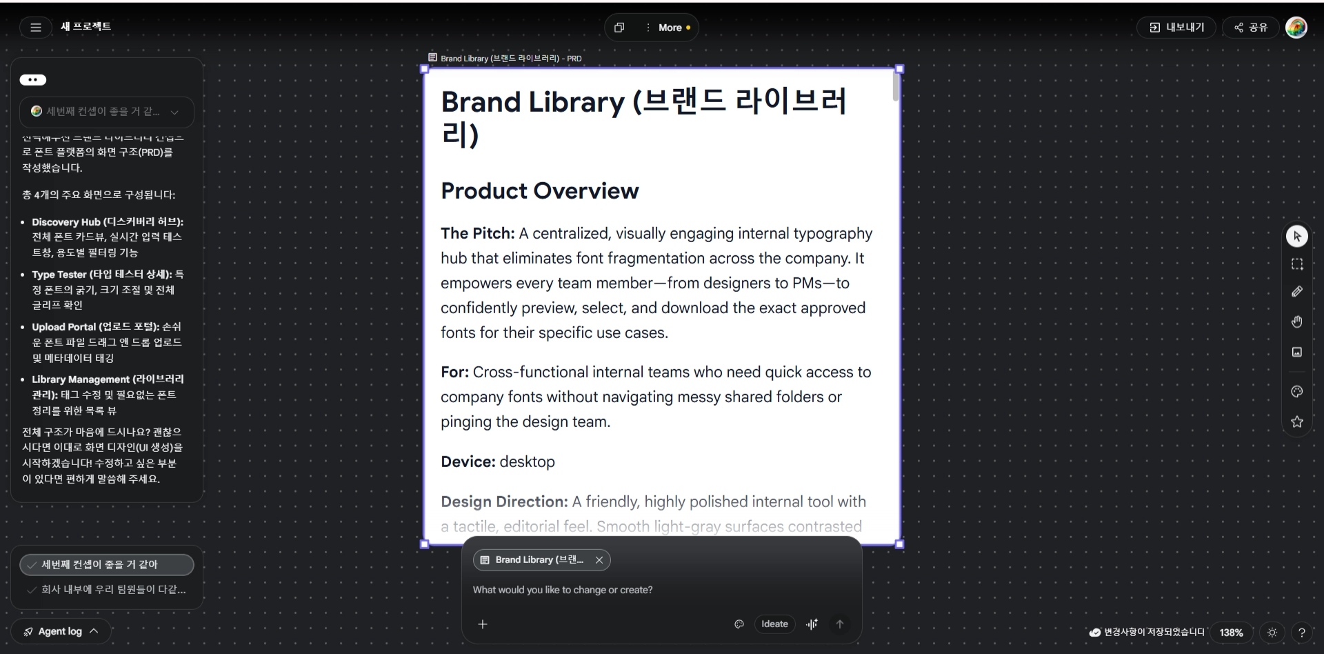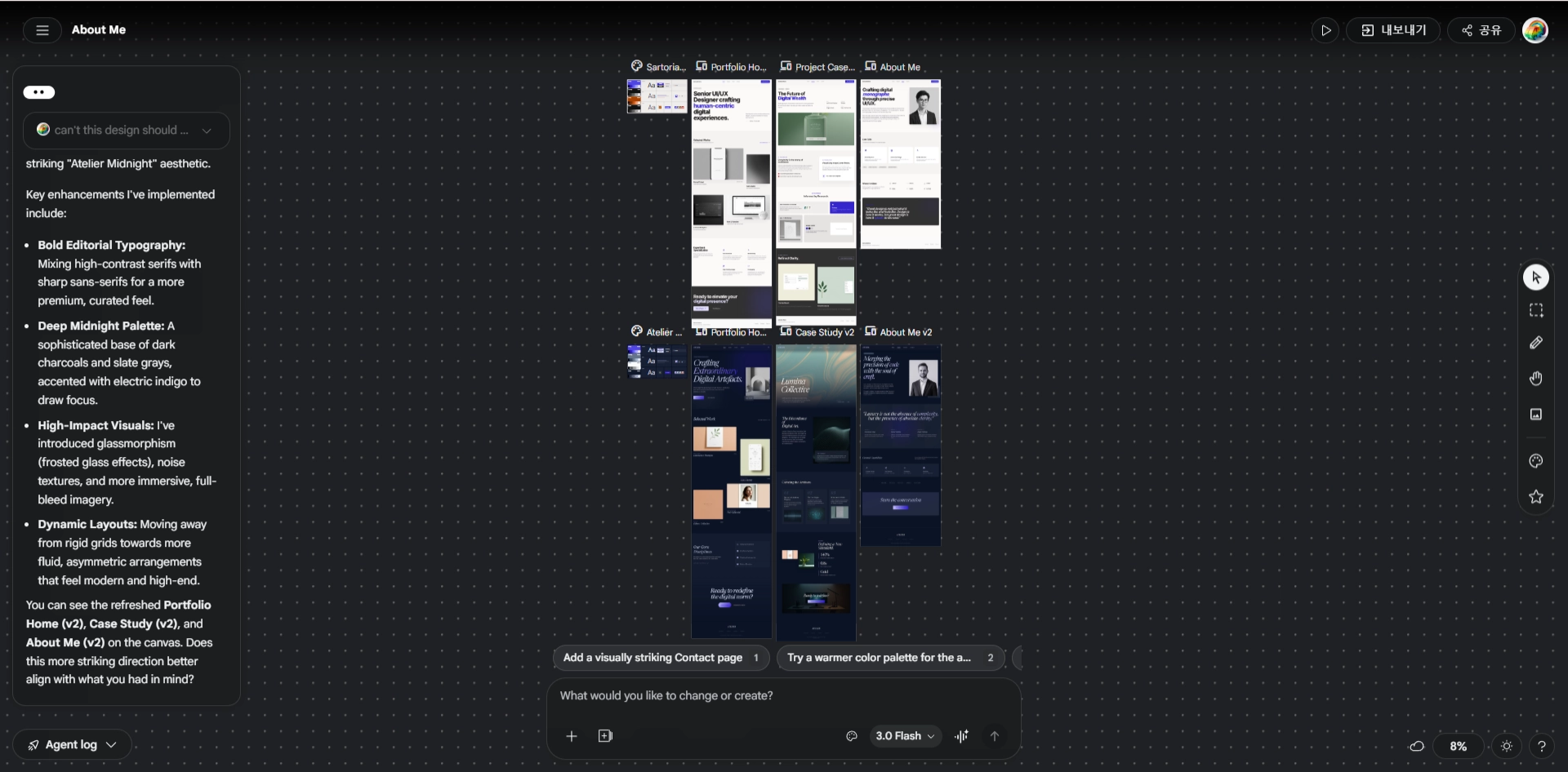 한 가지 큰 변화로는 ‘디자인 시스템’이 생겨났다. 디자인을 만들어달라고 프롬프트를 입력하면, 디자인을 들어가기 전에 디자인 가이드를 선 작성하고, 오른쪽 메뉴에서 컬러와 글꼴을 선택해 적용할 수 있는 옵션을 제공한다. 프롬프트를 추가로 입력해 디자인이 바뀌고 새로운 디자인 가이드가 나오더라도 디자인 가이드 히스토리가 쌓여 두번째 버전 디자인에 첫번째 버전 스타일 가이드를 적용해볼 수도 있다.