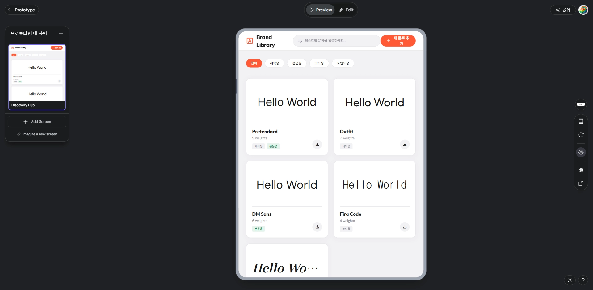프로토타입 미리보기 창에서도 화면 수정, 새로운 화면 만들기 등이 지원된다.