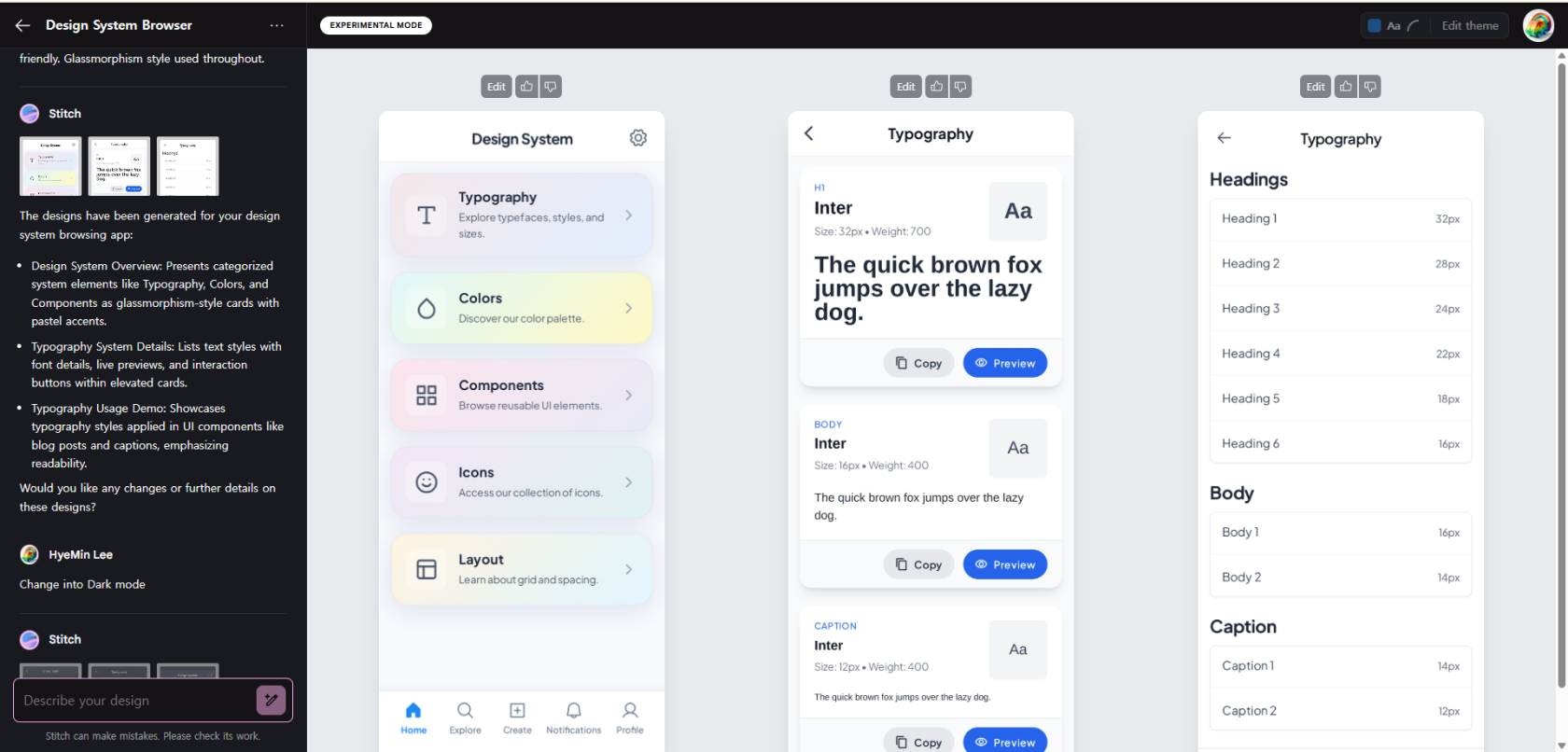 Stitch가 Gailieo AI일때부터 이 서비스를 써왔는데, 기능 면에서는 괄목상대 할 정도로 많아졌고, 좋아졌다. 디자인의 수준도 예전보다는 많이 나아졌다. 30분도 안돼서 화면 기획에 디자인 초안, 프로토타입까지 뽑아낼 수 있을 정도면 초기 디자인 작업에서 활용도가 꽤 높을 것으로 기대가 된다.